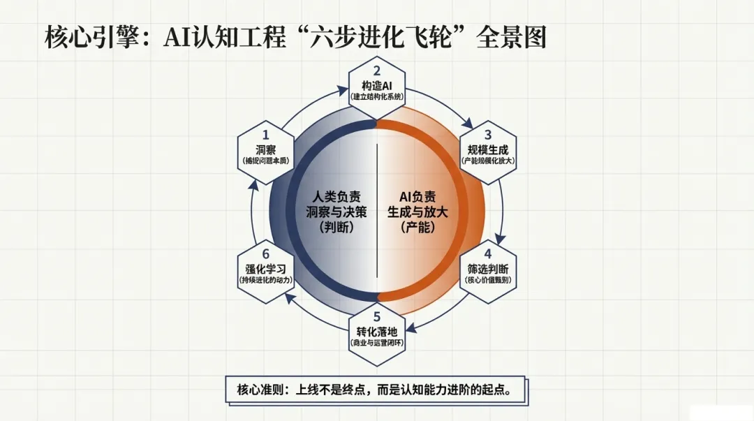 其核心方法论可凝练为一条循环主轴:洞察 → 构造AI → 规模生成 → 筛选判断 → 转化落地 → 强化学习。这条主轴并非线性流程,而是持续运转的闭环飞轮,每一次循环都推动系统认知能力进阶。飞轮高效运转,需三大能力协同发力:外部感知捕捉用户、场景、趋势等洞察素材,AI技术支撑规模化生成与效率提速,人类判断把控关键决策节点。人类负责洞察与决策,AI负责生成与放大,二者各司其职、互不越位,形成高效协同。