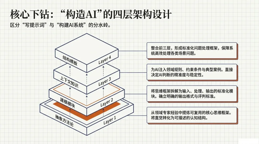 这是方法论体系的核心环节,也是区分「使用AI工具」与「构建AI系统」的关键。构造AI并非简单选择模型、编写提示词、搭建工作流,而是上游的核心工作:将专家隐性认知,转译为AI可稳定运行的结构化体系,需分四个层级递进推进: