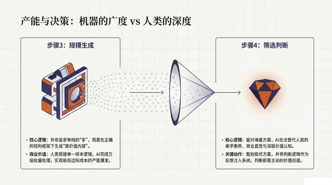 筛选判断并非被动审核,而是主动的价值创造:人类从海量生成内容中提炼高价值成果,再将判断逻辑通过反馈机制注入系统,持续优化AI生成质量。