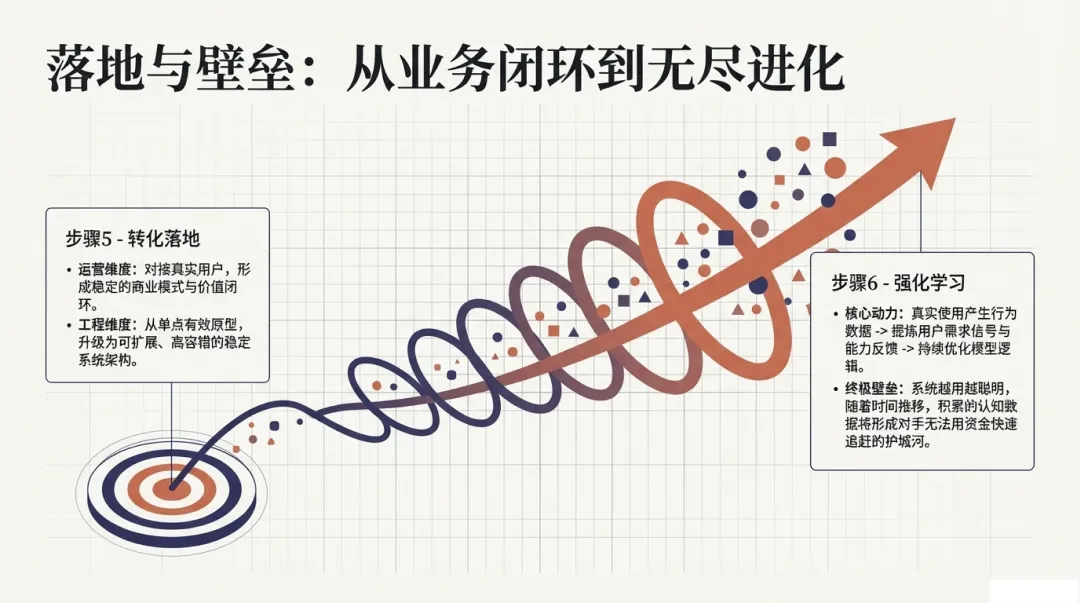 这是飞轮闭环的最后一环,也是系统持续进阶的关键。产品上线后,每一次用户使用都会产生行为数据,数据中包含系统决策样本、用户真实需求信号、AI能力优劣反馈等核心信息。强化学习的本质,就是从数据中提炼有效信息,持续优化提示结构、工作流逻辑、判断规则,让系统越用越精准。长期坚持这一环节,系统的竞争护城河会随使用时长不断加深,形成难以复制的优势。