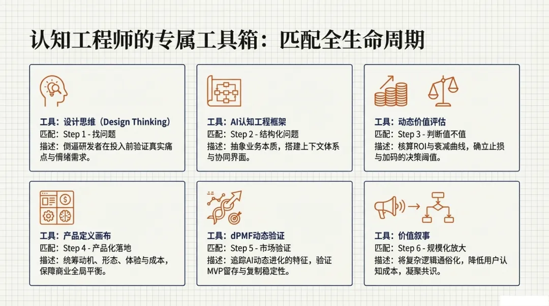 将AI认知工程方法论落地到产品全生命周期,对应一套可实操的六步框架,每一步均配备专属工具,精准解决产品研发各阶段的核心痛点,实现从理念到实操的无缝衔接。