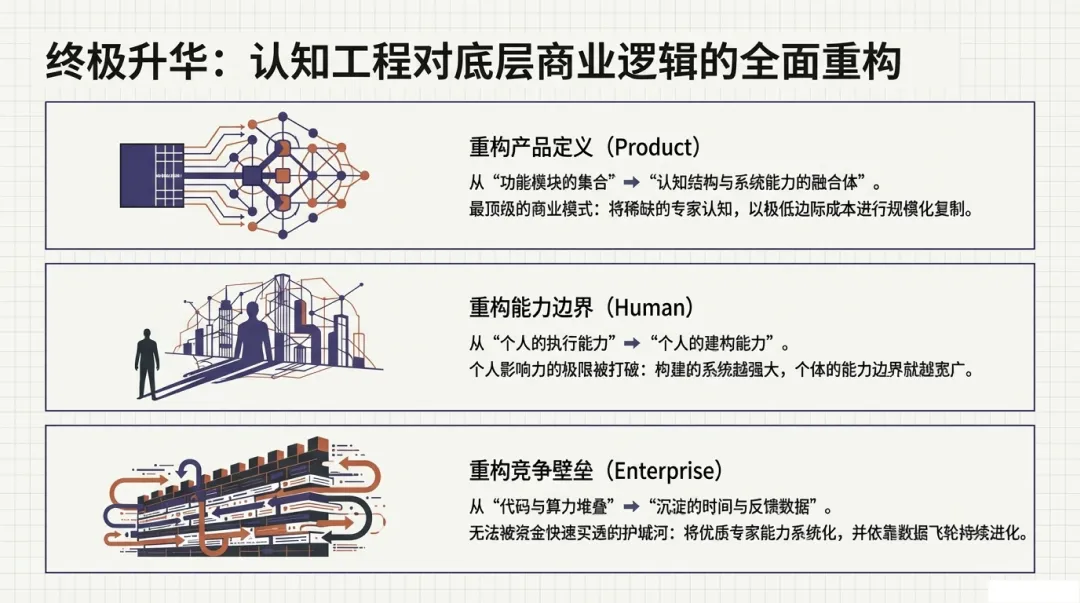 产品不再是功能模块的简单集合,而是认知结构与系统能力的融合体。产品研发的核心问题,从「功能能否实现」转变为「系统封装了何种认知、替代或增强了哪类决策」。未来最具价值的产品,是将稀缺专家认知,以极低边际成本规模化复制的认知系统。