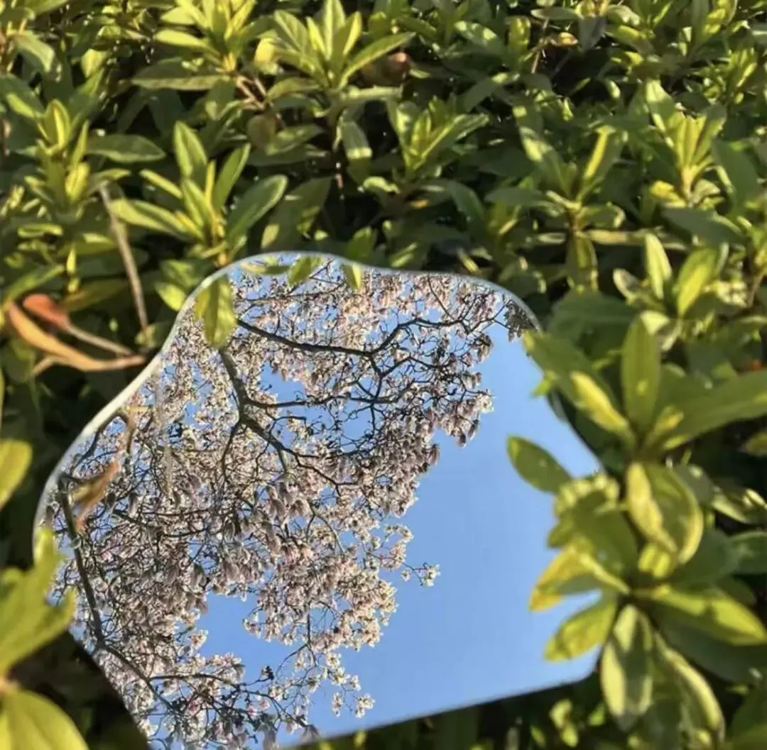 💫以前总觉得镜子就是补妆用的,现在发现它才是拍照作弊神器!不用找角度,不用调滤镜,把春天的花、路边的树都装进去,朋友圈九宫格直接凑齐,连文案都省了~