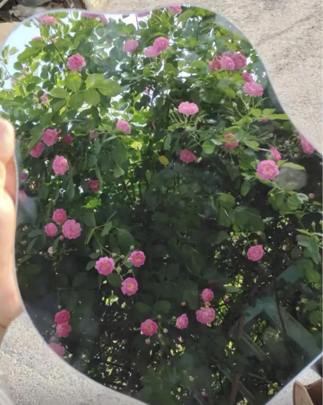 💫这面镜子直接把春天框进手里了不规则的云朵边,拿在手里软乎乎的,往花丛里一放,镜子里是粉花蓝天,镜子外是绿意盎然,随手一拍就是氛围感大片!