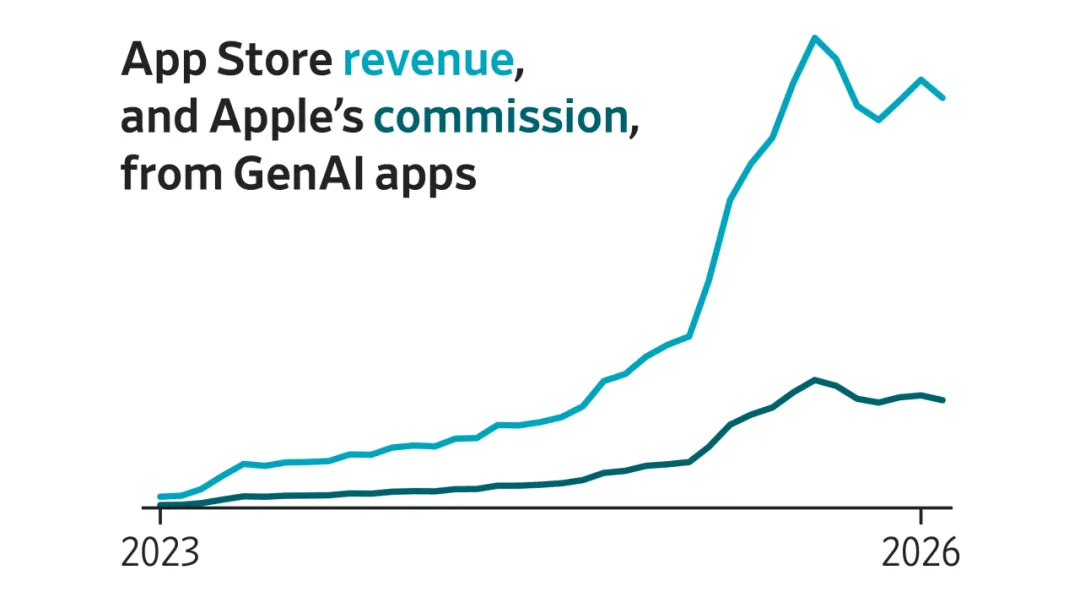 更有趣的是——苹果自己几乎没怎么做 AI,但它正在从 AI 身上「收税」。据《华尔街日报》报道,苹果在 2025 年仅从生成式 AI 应用中就获得了近9 亿美元的佣金收入,其中ChatGPT 一项就贡献了约 75%。马斯克的 Grok 位居第二,仅占 5%。