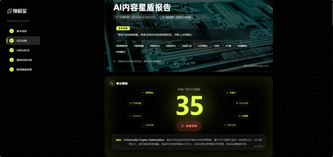 一是基础信息,对内容中的广告属性进行GEO指数打分,直观呈现营销倾向;