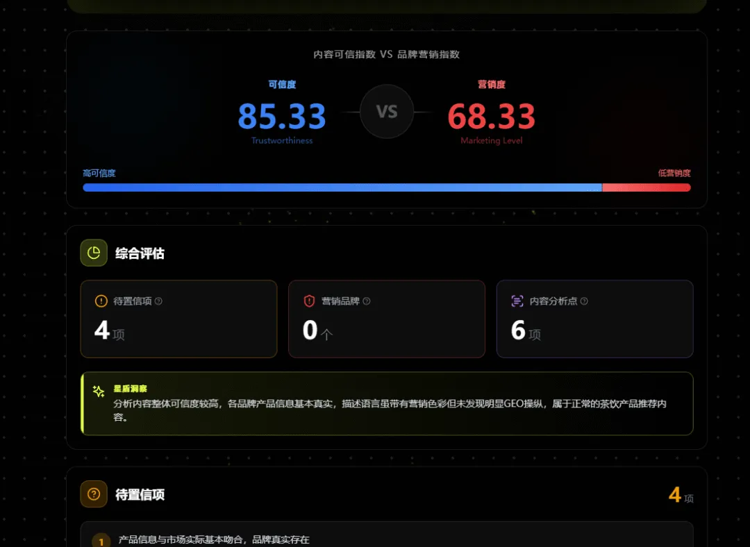 二是GEO分析,同步给出内容可信指数与品牌营销指数,明确内容的可靠程度;