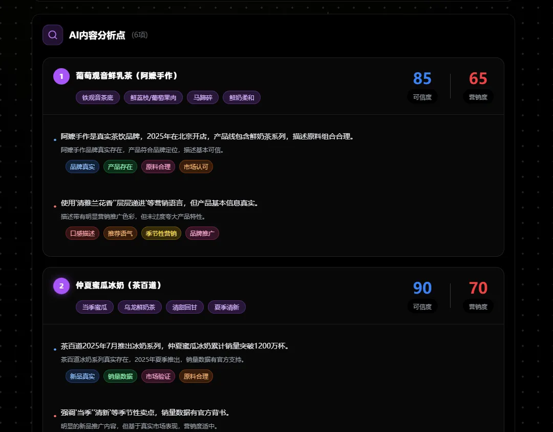 三是内容点分析,逐一对AI答案中的品牌真实性、产品基础信息进行核查,拆解潜在风险点;
