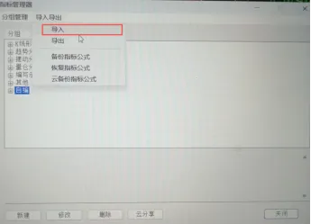 3. 导入操作:在指标管理器中点击 “导入导出”→“导入”,选中准备好的指标文件,点击 “打开” 即可完成导入。