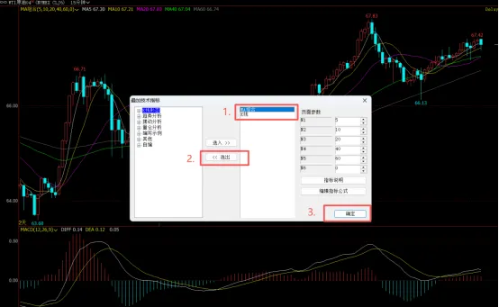4. 加载使用:为更直观查看建议先取消原MA均线、裸K、MACD等主/副图指标,然后在 K 线图右键→“技术指标”,在 “自编” 分类中找到导入的拓米图指标,点击即可加载到主/副图。