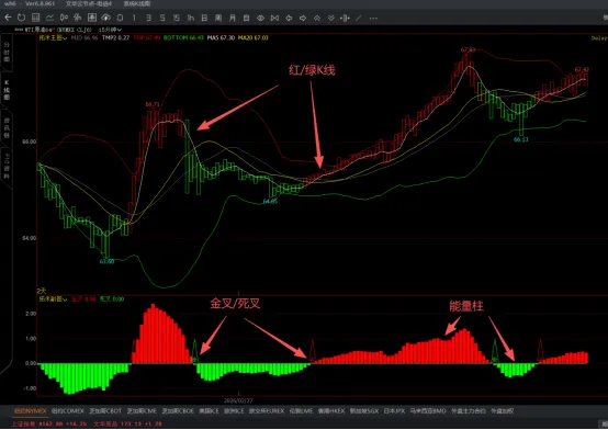 副图用法:红柱 = 多头能量、绿柱 = 空头能量;金叉 / 死叉做买卖参考;