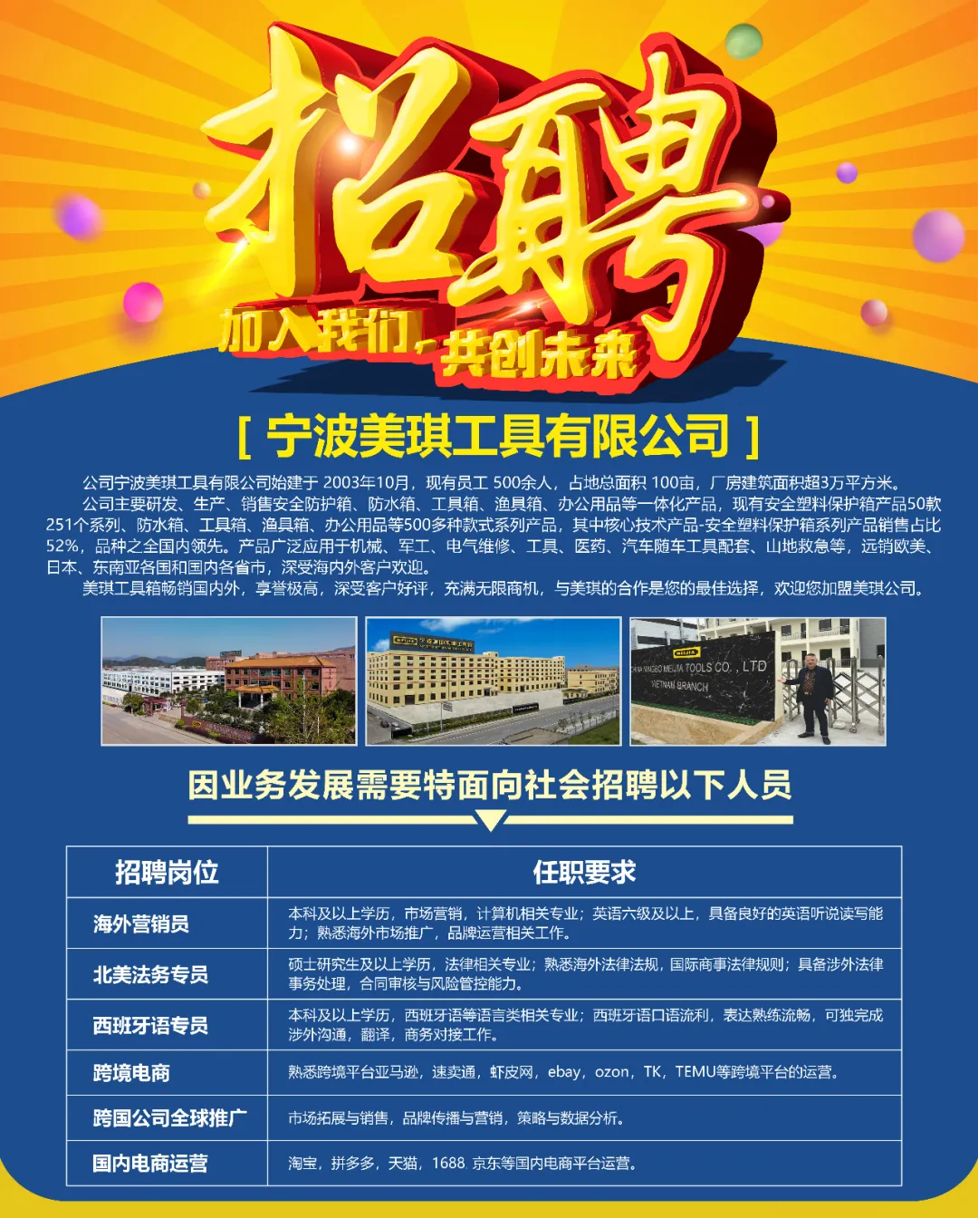 宁波美琪工具有限公司2026年3月28日在上海徐汇区大木桥路108号现场招聘海外营销员、跨境电商、跨国公司全球推广、国内电商运营等