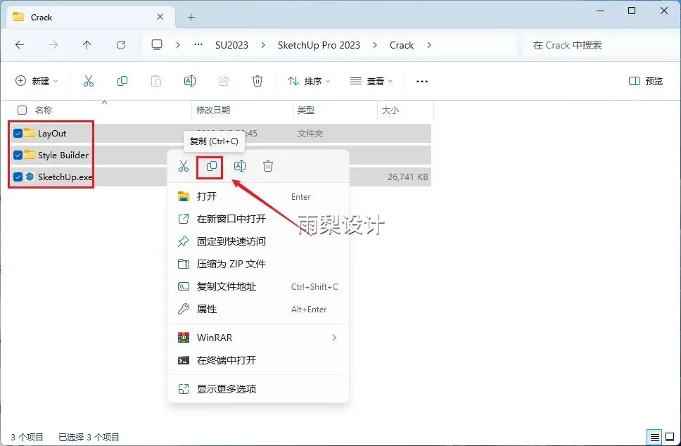 8.返回安装包下的【Crack】文件夹;右键【三个文件】选择【复制】