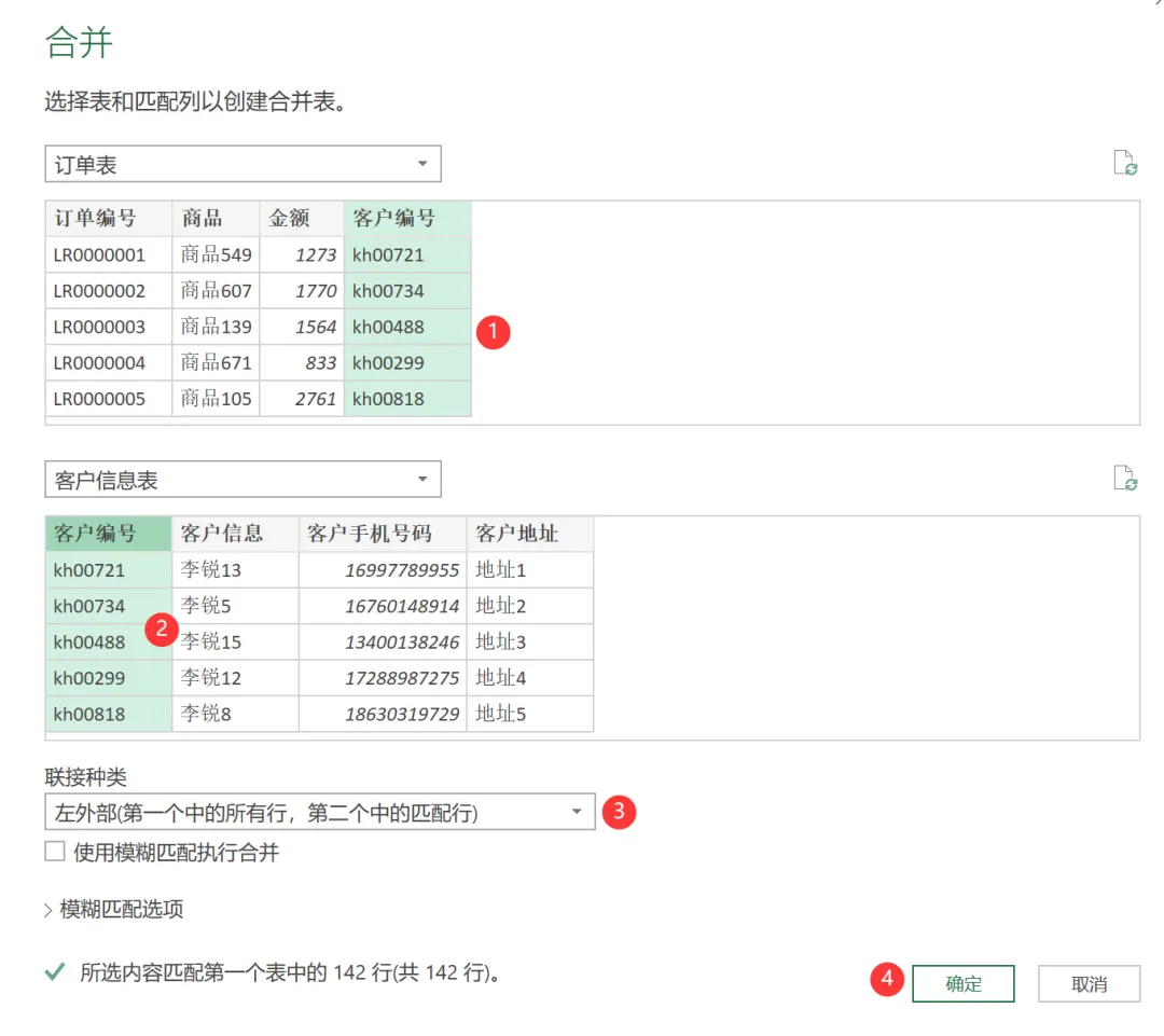 某企业的订单表和客户信息表分别放置在不同的Excel工作表中,订单表中包含订单编号、商品、金额、客户编号共计10万条订单记录,客户信息表中包含客户编号、客户信息、客户手机号、客户地址共计10万条客户记录。要求对这20万条记录进行整合,在订单表中根据客户编号添加客户信息、客户手机号、客户地址,数据源如下图所示。