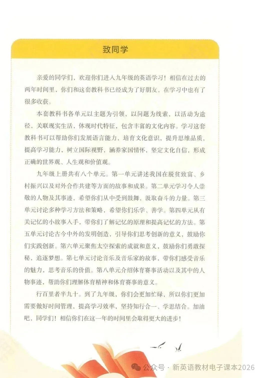 亲爱的同学们,欢迎你们进人九年级的英语学习!相信在过去的两年时间里,你们和这套教科书已经成为了好朋友,在学习中也有了很多收获。