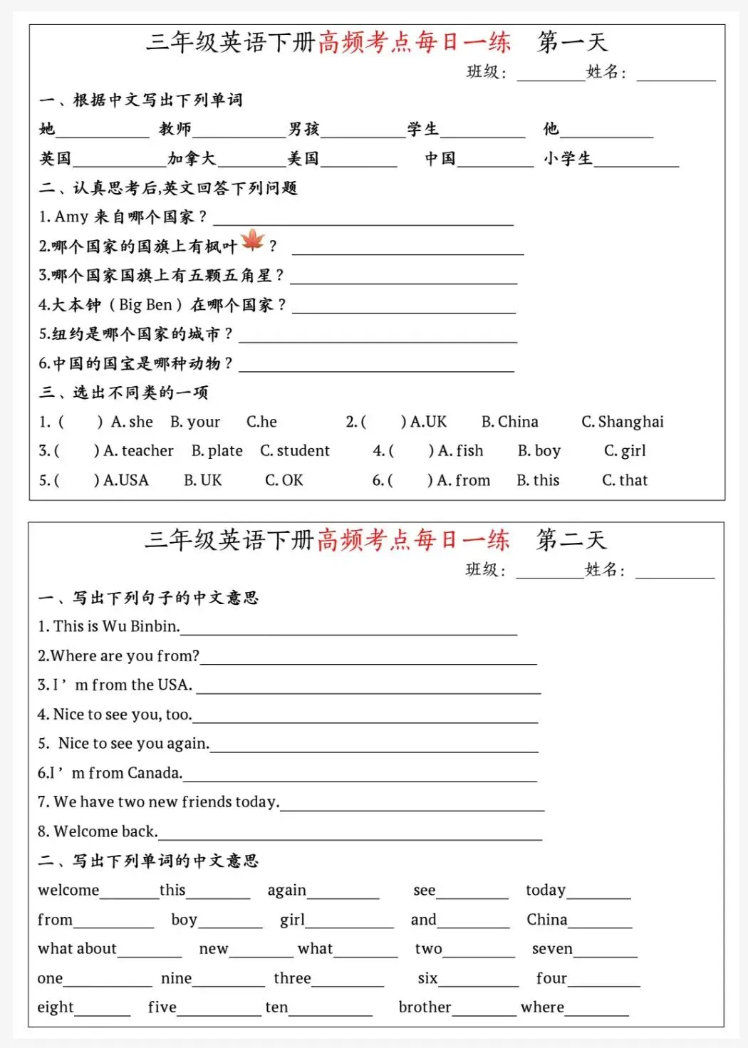 三年级英语下册高频考点每日一练,可下载