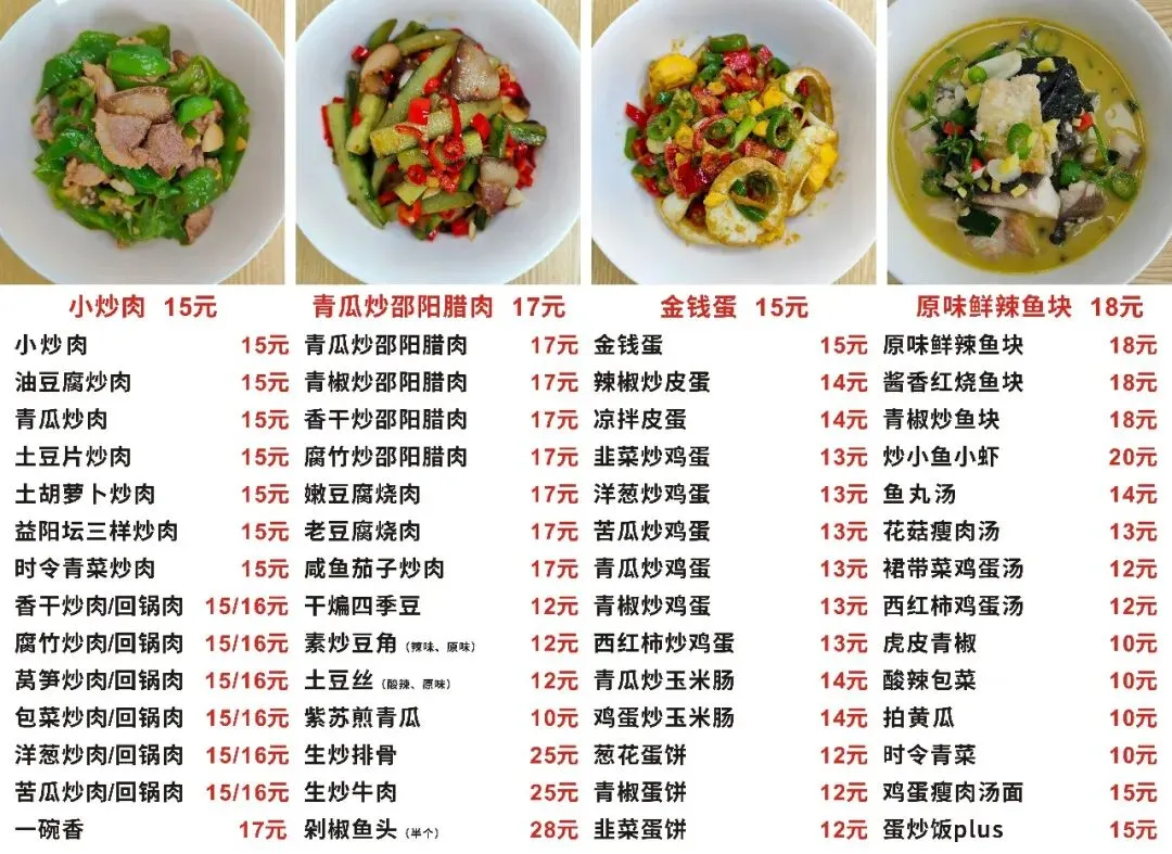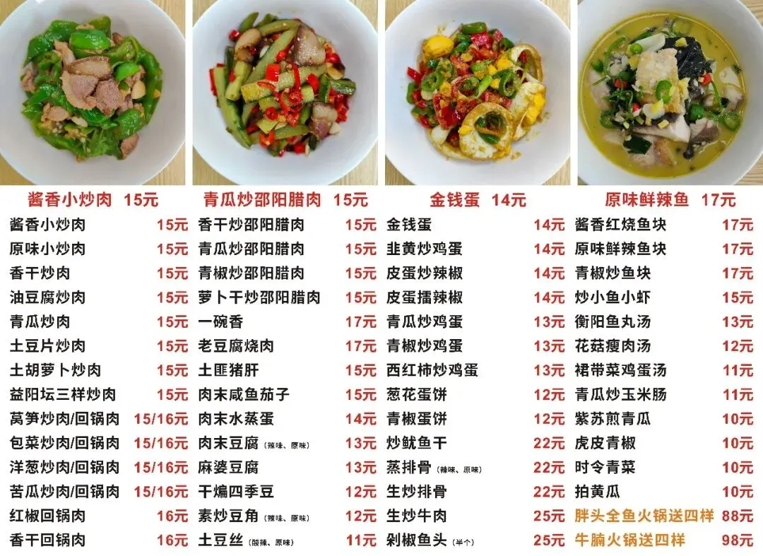 下架了原味小炒肉、红椒回锅肉、萝卜干炒腊肉、土匪猪肝、肉末水蒸蛋、肉末豆腐、麻婆豆腐、韭黄炒鸡蛋、皮蛋擂辣椒、炒鱿鱼干、蒸排骨、胖头鱼火锅、牛腩火锅等13个菜品。