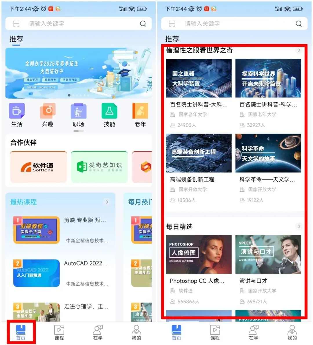 1、安装后打开工具,在“首页”里可以看到软件包含了各种教程,如果不知道看什么,可以看看首页的推荐,有科学,有软件技术等,非常不错。