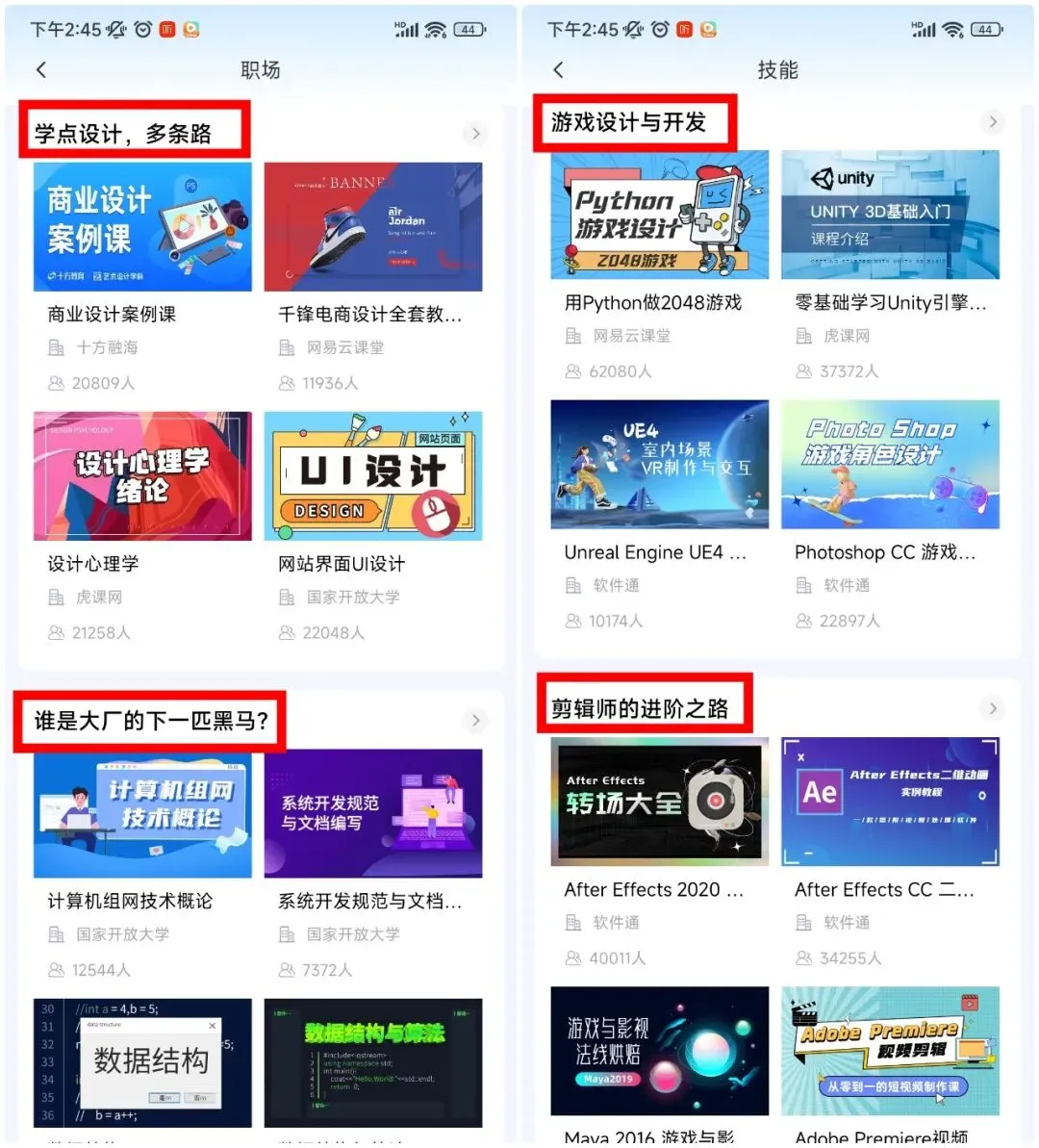 2、点击分类菜单,可以看到每个分类下的详细课程,非常全面。比如UI设计,策划、游戏设计与开发,剪辑软件教程等。