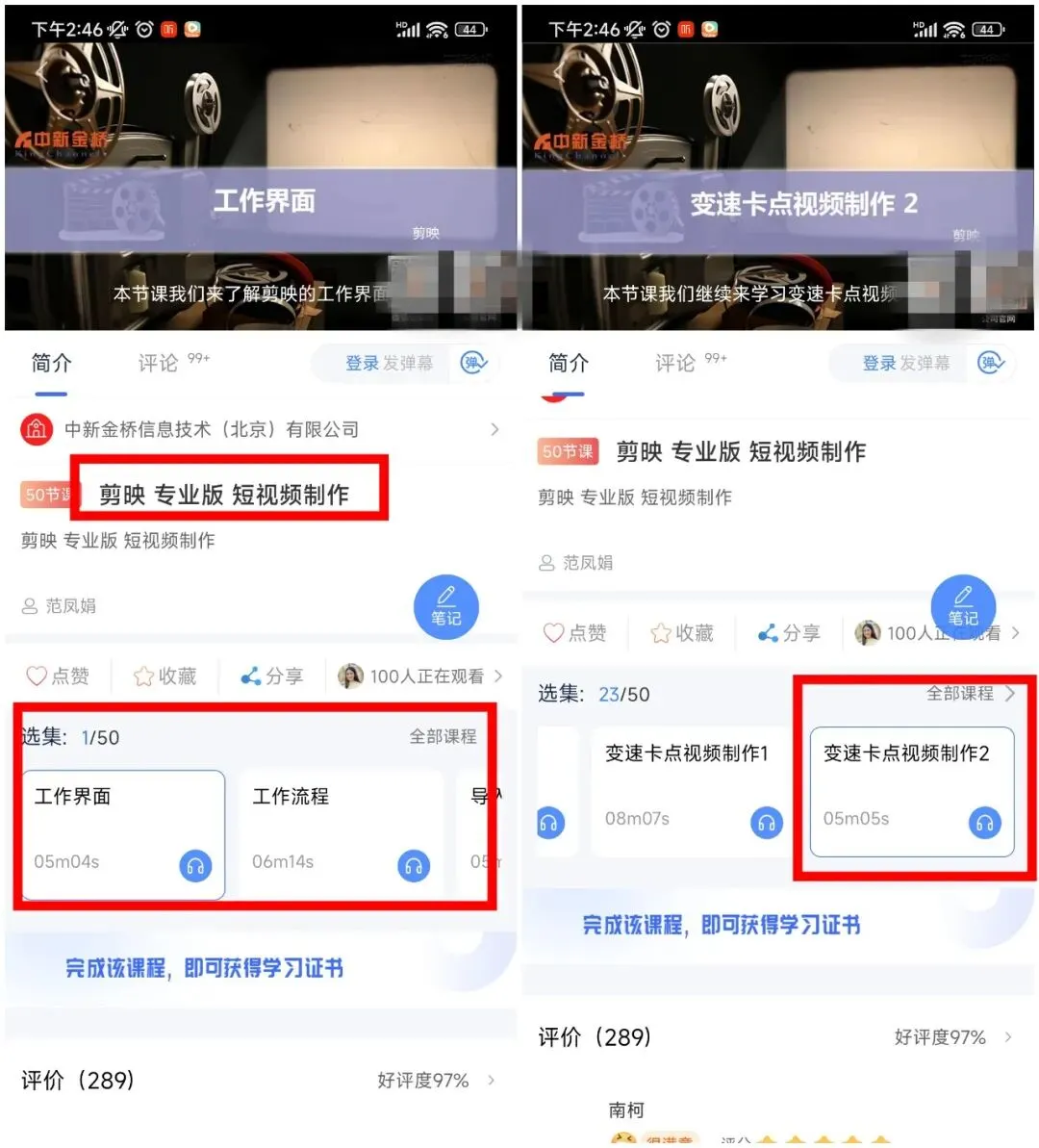 3、点击进入自己想看的课程,即可观看。比如这个剪辑软件的教程,就非常细致,可以反复观看。