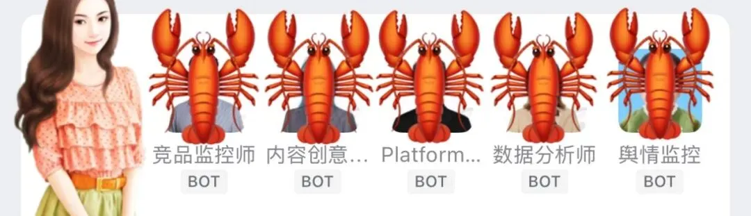 每只🦞都有自己的专业领域,持续学习和沉淀,把他们拉到一个群里,他们可以互相流转信息。(头像用的都是我朋友的,这也是一些牛马乐趣)