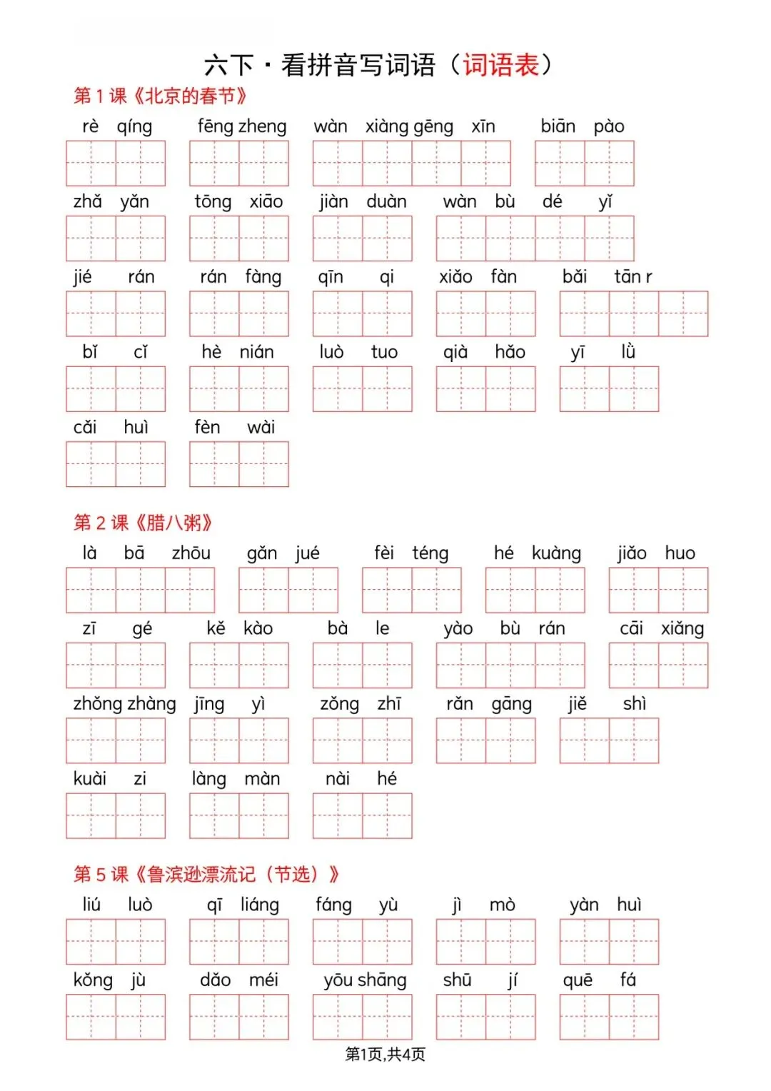 本资料为部编版六年级下册语文全册看拼音写词语专用词语表,严格同步教材课后 “词语盘点”,按课文 / 单元系统整理,含拼音 + 词语双栏对照,可直接打印用于听写、默写、复习,是六年级语文基础字词过关、小升初字词专项备考的核心资料。