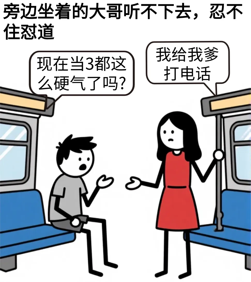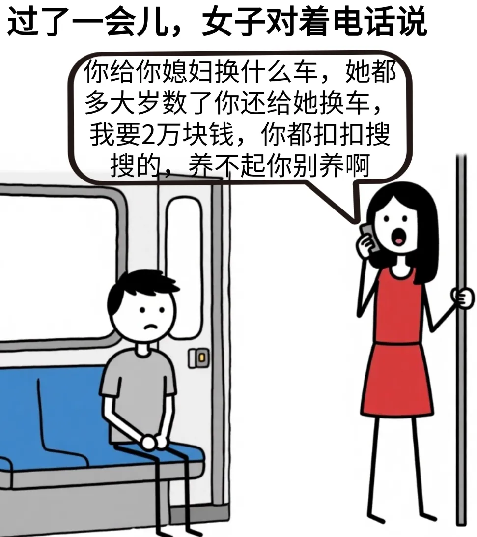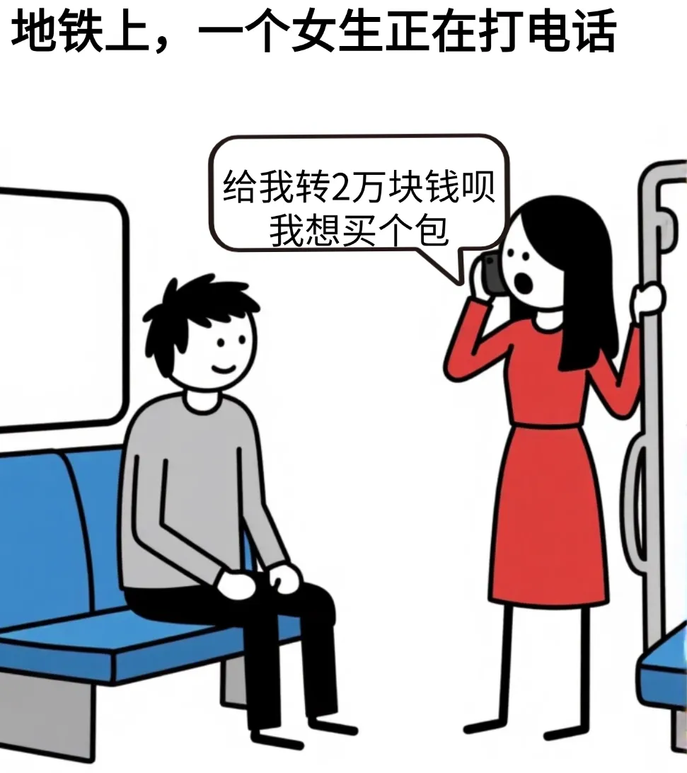 开心漫画:地铁上,一个女生正在打电话:给我转2万块钱呗,我想买个包,过了一会儿,女子对着电话大声说道:你给你媳妇换什么车…