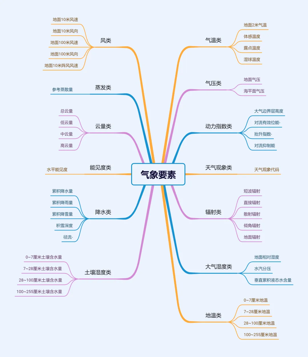 天气预报数据和历史天气数据共分为气温、气压、相对湿度、风、降水量、云、能见度、天气现象等13大类,其中天气预报数据一共有32种,历史天气数据一共有40种,覆盖了科研领域的绝大多数地面气象数据使用场景。