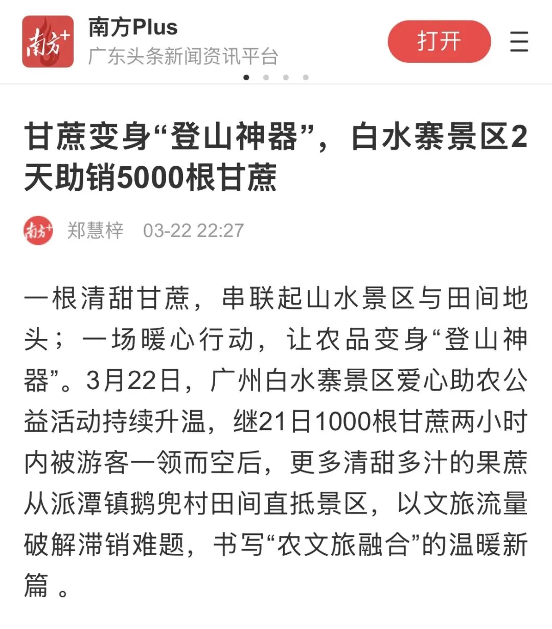 一根清甜甘蔗,串联起山水景区与田间地头;一场暖心行动,让农品变身“登山神器”。3月22日,广州白水寨景区爱心助农公益活动持续升温,继21日1000根甘蔗两小时内被游客一领而空后,更多清甜多汁的果蔗从派潭镇鹅兜村田间直抵景区,以文旅流量破解滞销难题,书写“农文旅融合”的温暖新篇。