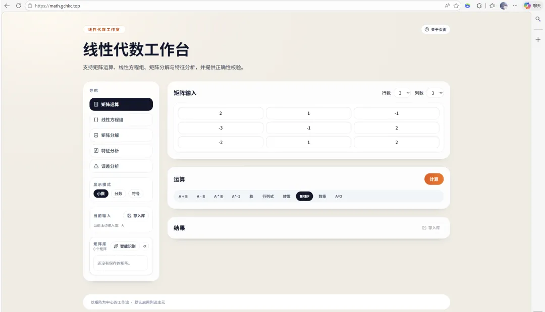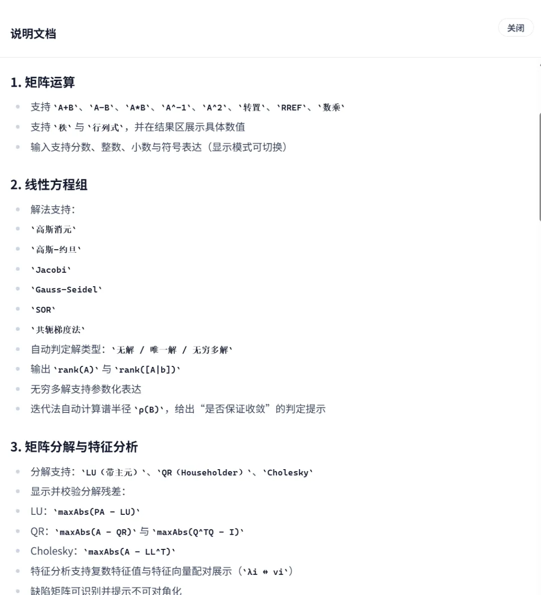 这是网页示例界面,包含矩阵运算,支持 A+B、A-B、A*B、A^-1、A^2、转置、RREF、数乘;支持 秩 与 行列式,并在结果区展示具体数值;输入支持分数、整数、小数与符号表达(显示模式可切换);线性方程组;解法支持:高斯消元,高斯-约旦,Jacobi,Gauss-Seidel,SOR。共轭梯度法;自动判定解类型:无解 / 唯一解 / 无穷多解,输出 rank(A) 与 rank([A|b]),无穷多解支持参数化表达,迭代法自动计算谱半径 ρ(B),给出“是否保证收敛”的判定提示;矩阵分解与特征分析等等。