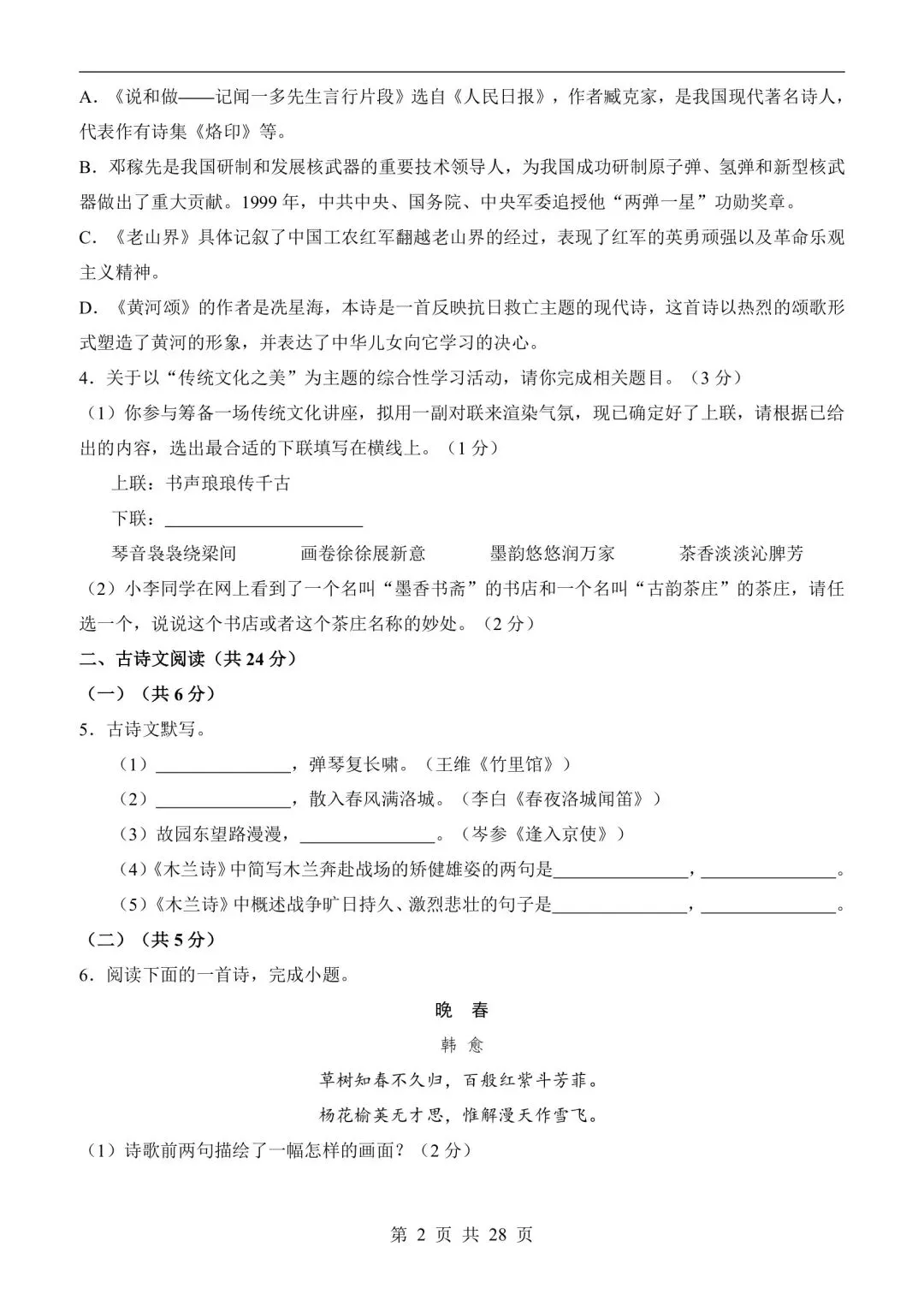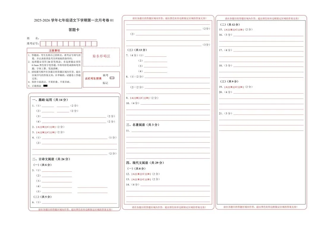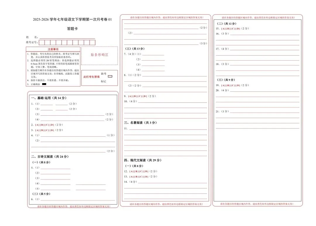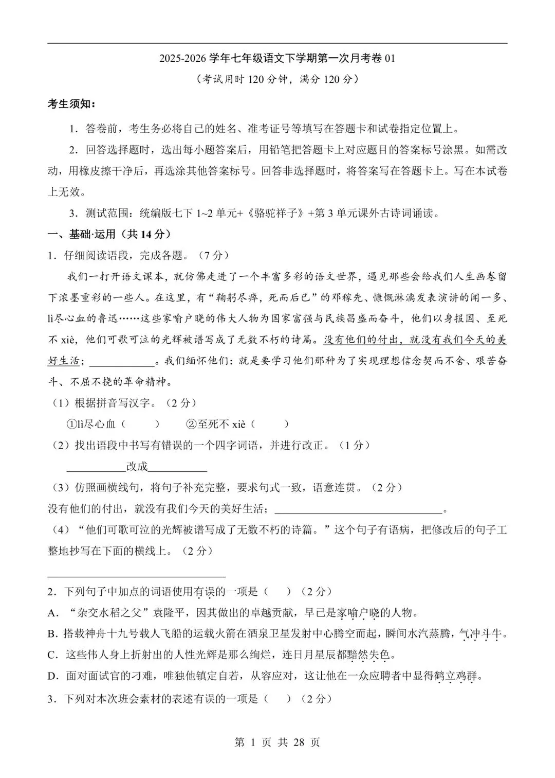 七年级语文下学期第一次月考测试卷含答案可打印