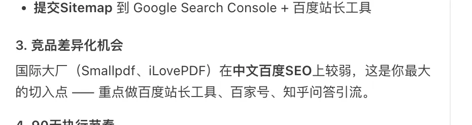 另外通过看同行的pdf网站,他们基本每天都在更新不同的关键词文章,不管是word转pdf,还是pdf转word,甚至是图片转pdf各个分类都是软件,而且对方是公司运营,从这个角度说明,这个pdf转换工具类目还是很卷的,所以,对于新站来说,可能需要比别人还要卷才行才有机会。后续需要尝试从每日一篇的关键词优化文章改为每日2篇,坚持发1个月测试下效果(不考虑是否收录的情况下,先做了再说)