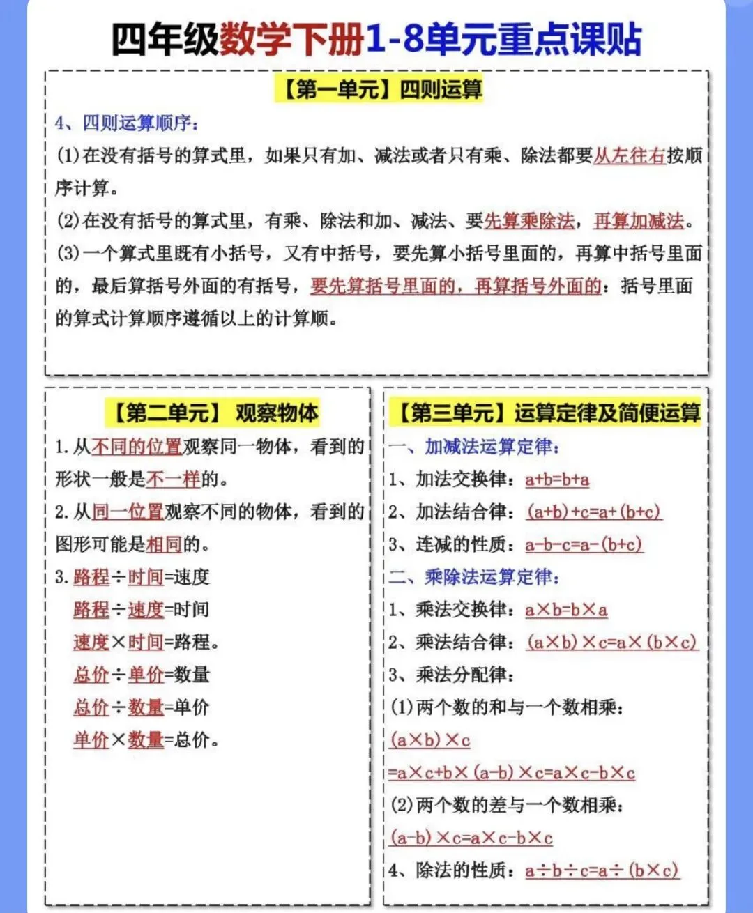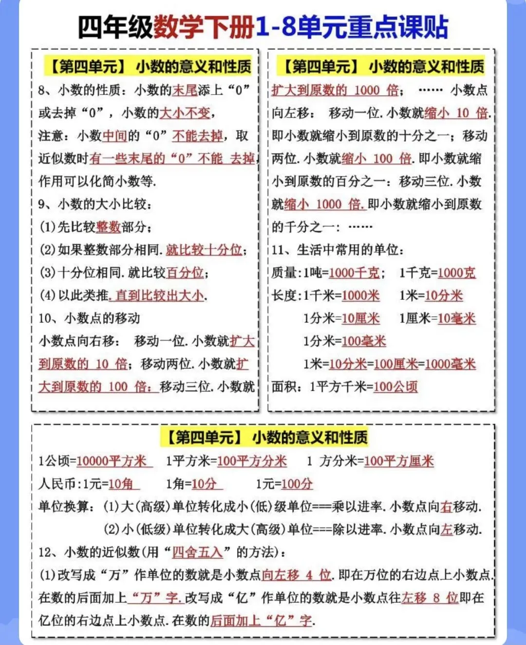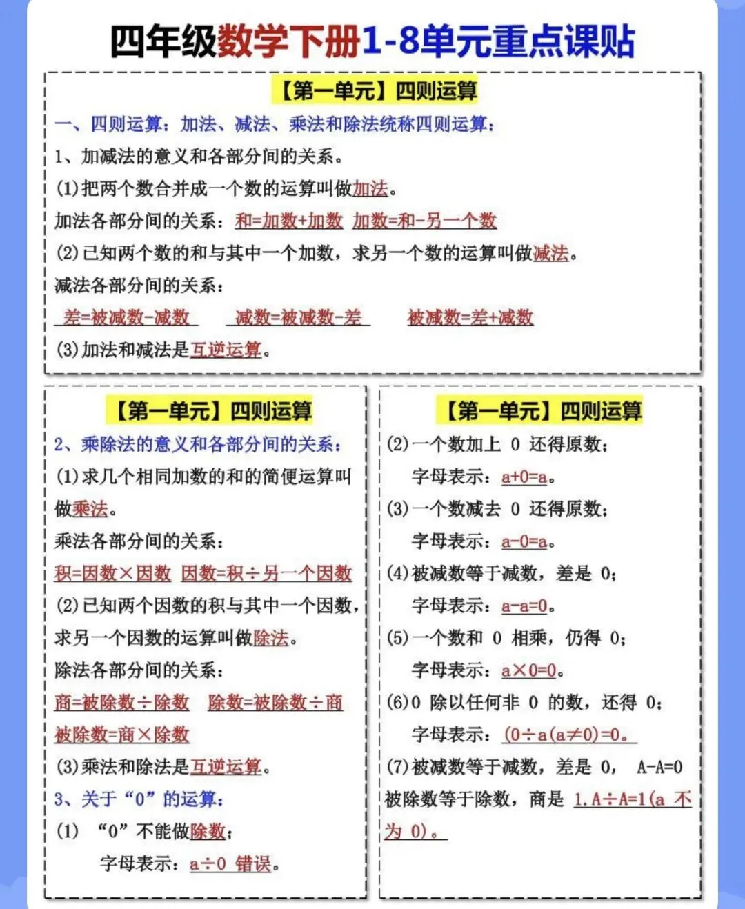四年级下册数学全册必背知识点课课贴及汇总!完整版可打印,抓紧给孩子打印出来熟记熟背🔥