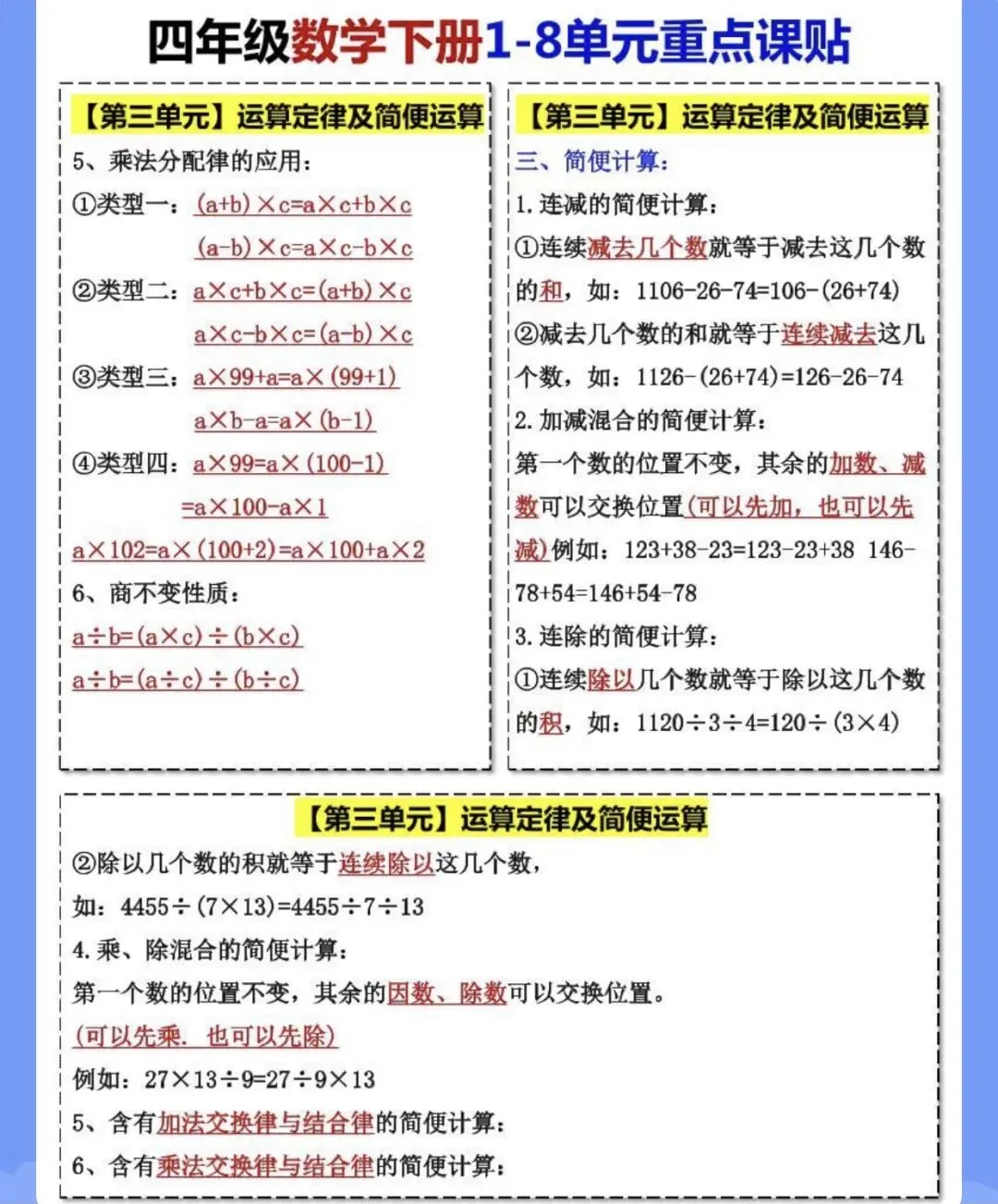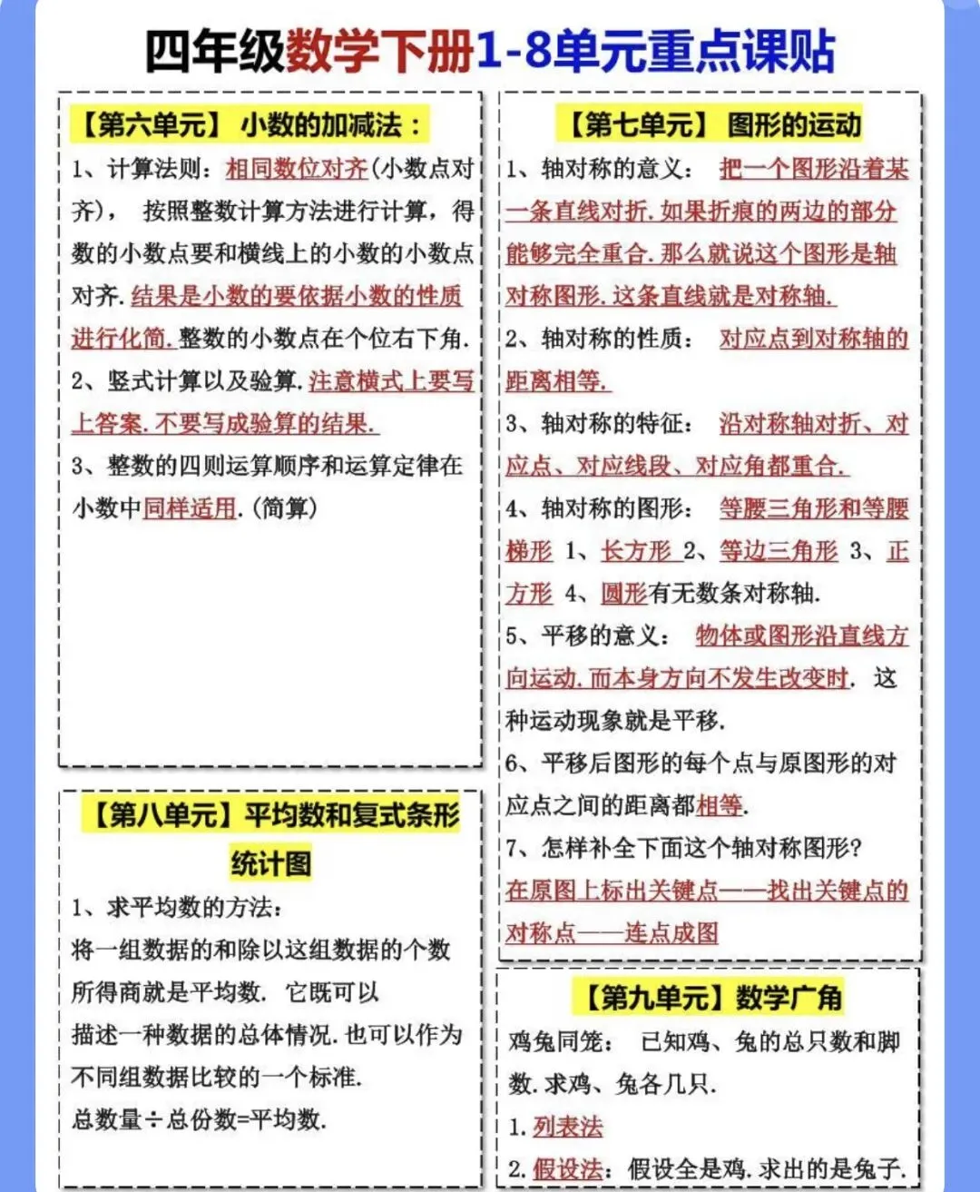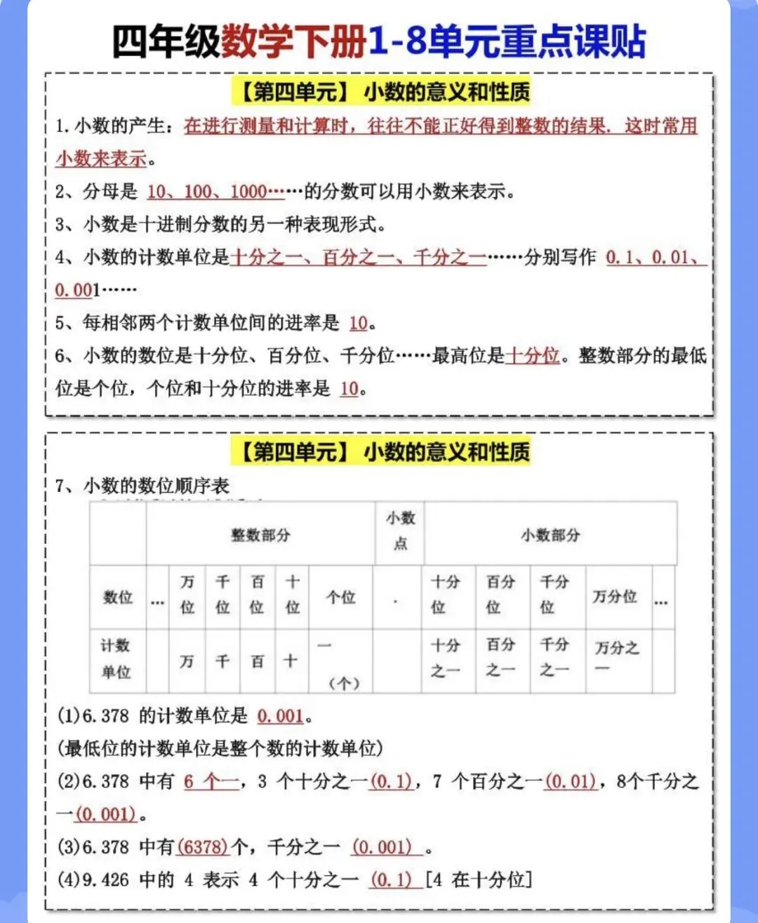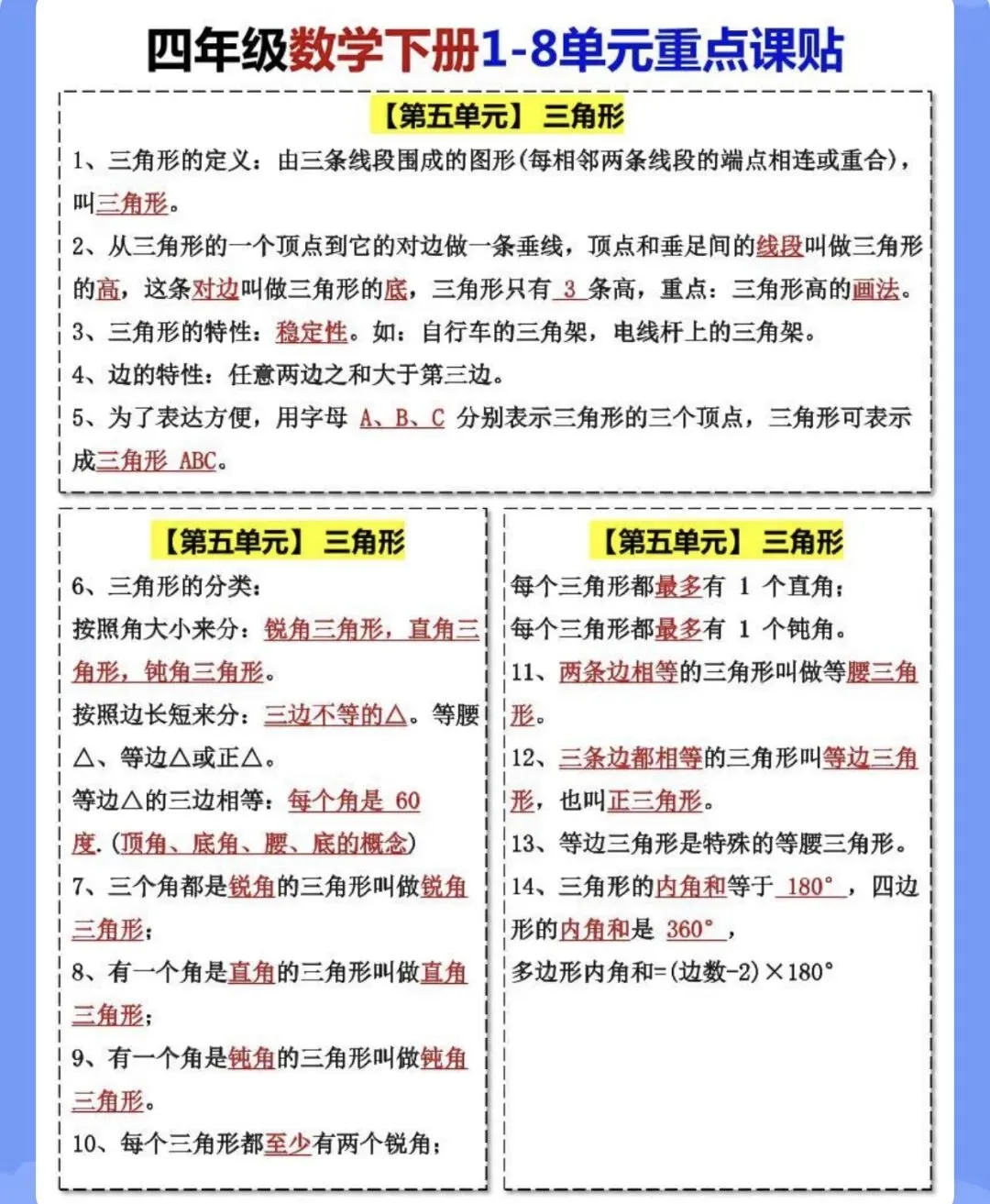 四年级下册数学全册必背知识点课课贴及汇总!完整版可打印,抓紧给孩子打印出来熟记熟背🔥