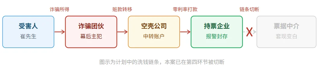 这类”通道型”空壳公司的核心功能是切断资金的直接联系。赃款从诈骗账户打入空壳公司,再由空壳公司流出购买票据,在账面上形成了两笔独立的交易。办案人员即便追踪到空壳公司,也需要再穿透一层才能找到上游的诈骗账户,而空壳公司通常没有实际经营,负责人失联,追查难度极大。
