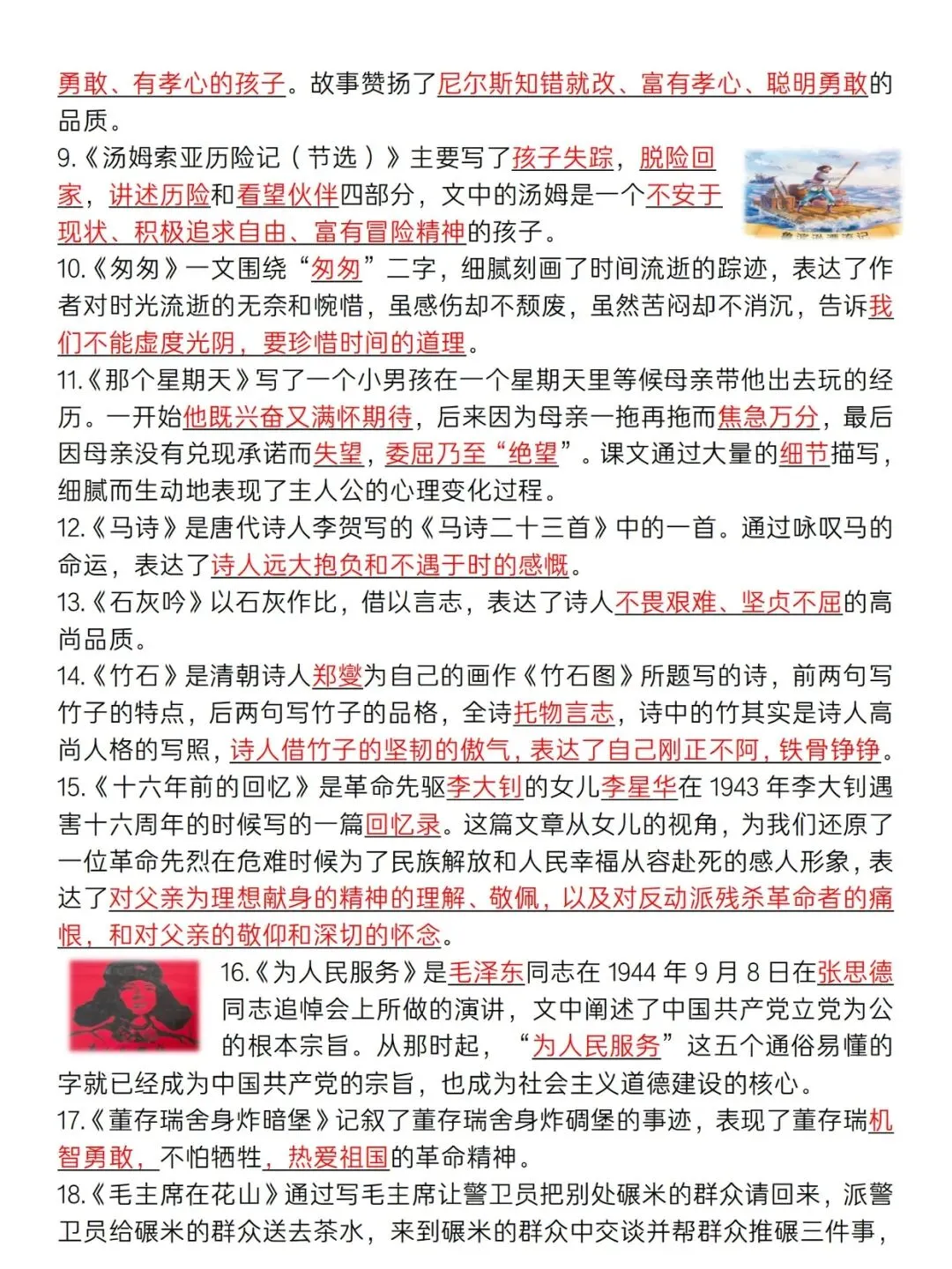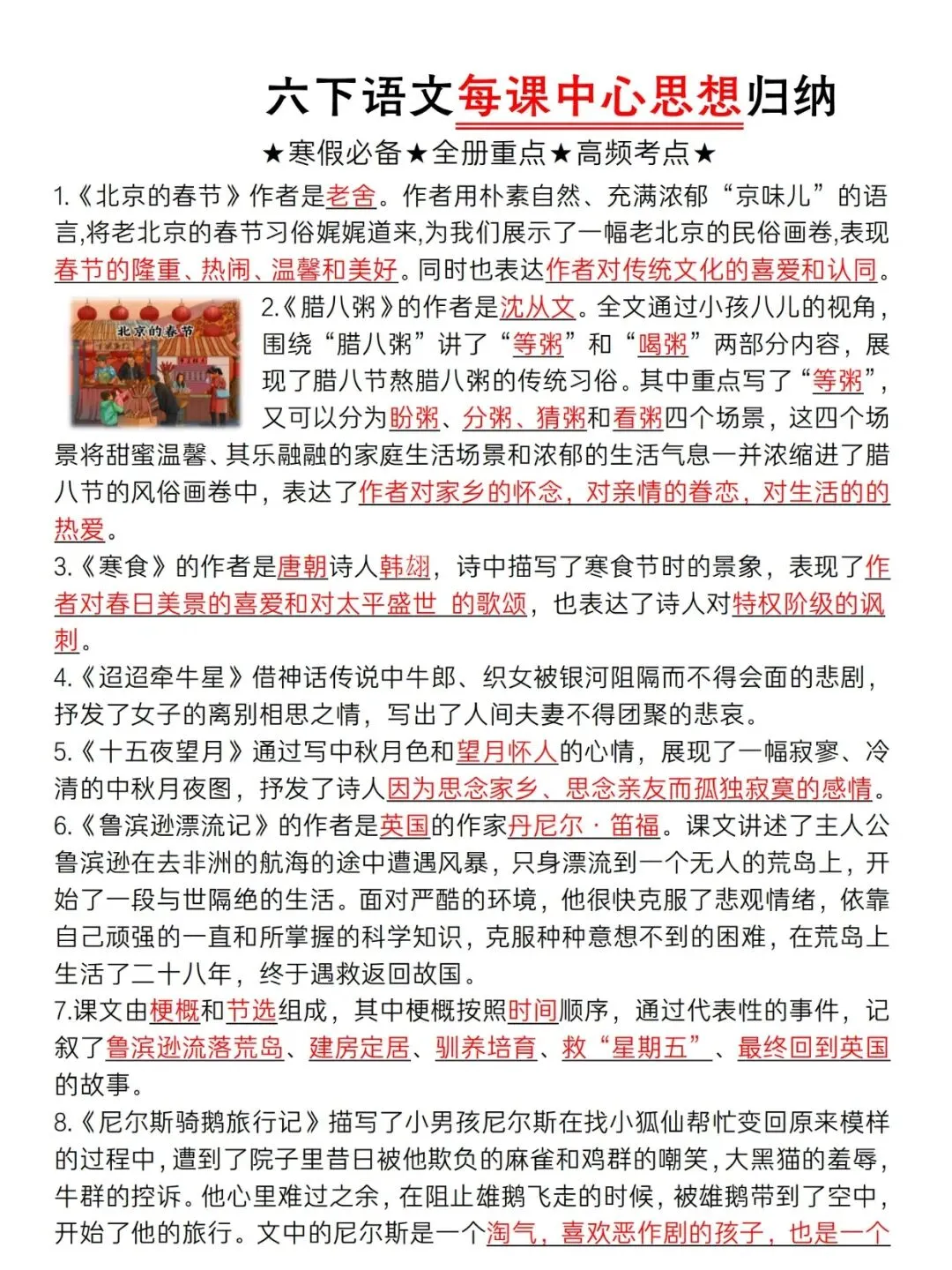 这份资料同步全册课文,逐课整理核心中心思想与课文主旨,归纳精准、重点突出,专为课内复习、阅读答题备考设计,帮孩子高效记忆考点、夯实课内功底,有需要的家长快给孩子打印收藏