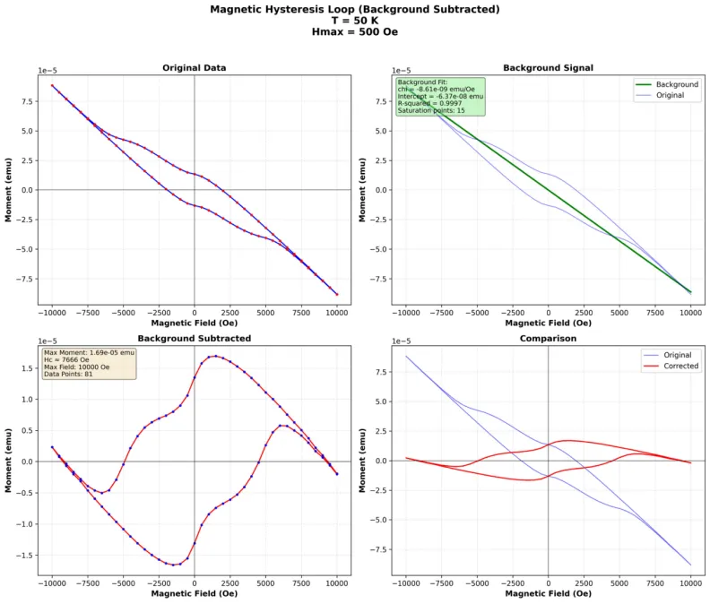物理实验中最常见的需求:处理 Quantum Design MPMS 测得的磁滞回线数据,去除背底信号。传统方式:2-3小时手动处理使用 OpenClaw:30秒自动完成9个文件的处理