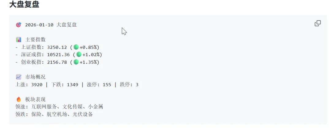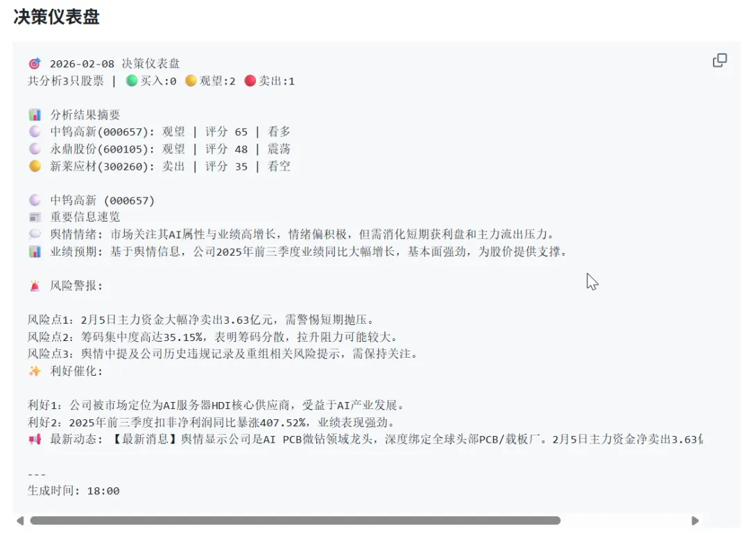 可以自动的实时分析大 A 数据,并精准的将股市情报数据、板块涨跌数据、技术面分析资金流动动向多维度的分析报告,及时推送到你的手机上(支持推送到企业微信、飞书、Telegram、Discord、Slack、钉钉、邮件、Pushover等)。