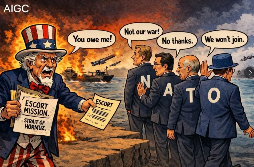 山姆手持护航:“你们欠我的!”;NATO:“不是我们的战争;对不起谢谢!我们不会加入!”