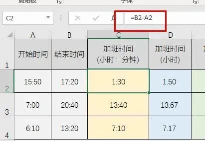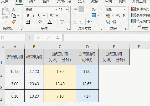 【举例】在下图加班时间表中,需要依据开始时间和结束时间,分别按照小时+分钟、小时、分钟三种方法,来计算加班时间。