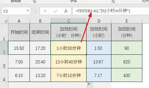 =TEXT(B2-A2,”[h]小时m分钟”)