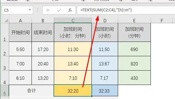 需注意,在对多个时间求和时,小时累计,若超过24小时,可使用text函数来显示大于24小时的时间,公式为: