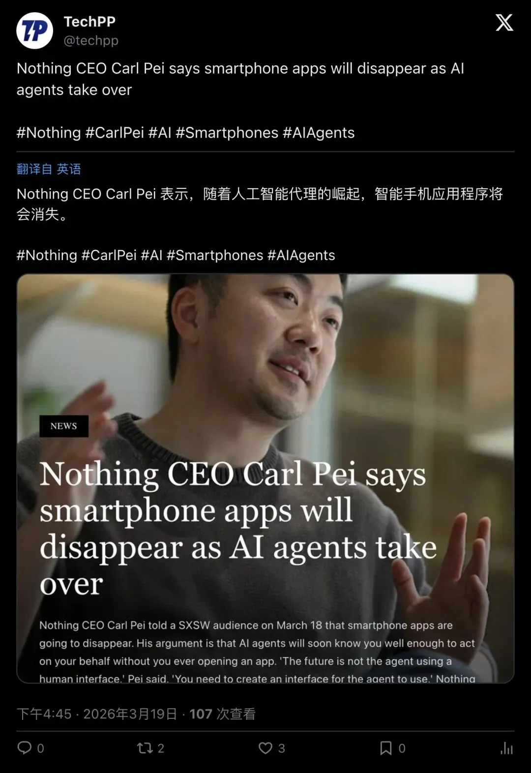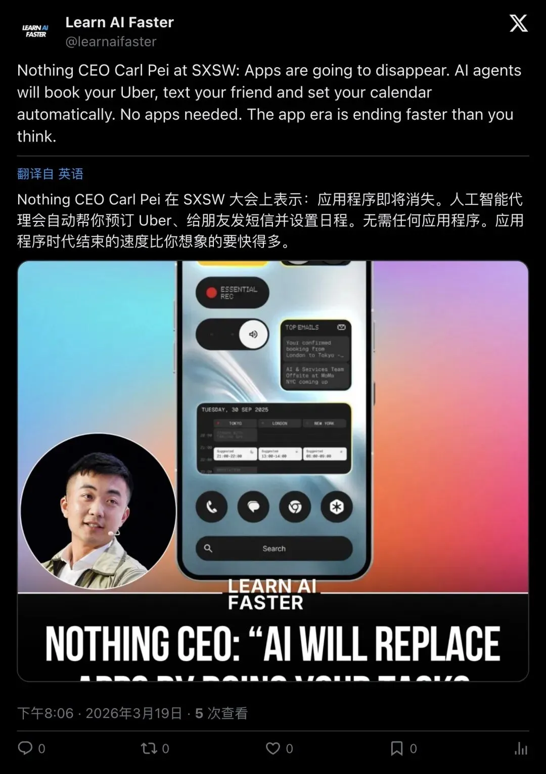 “Carl Pei 在 SXSW 抛下炸弹:App 会消失。如果你创业公司的核心价值在 App 里,不管你愿不愿意,都会被颠覆。”