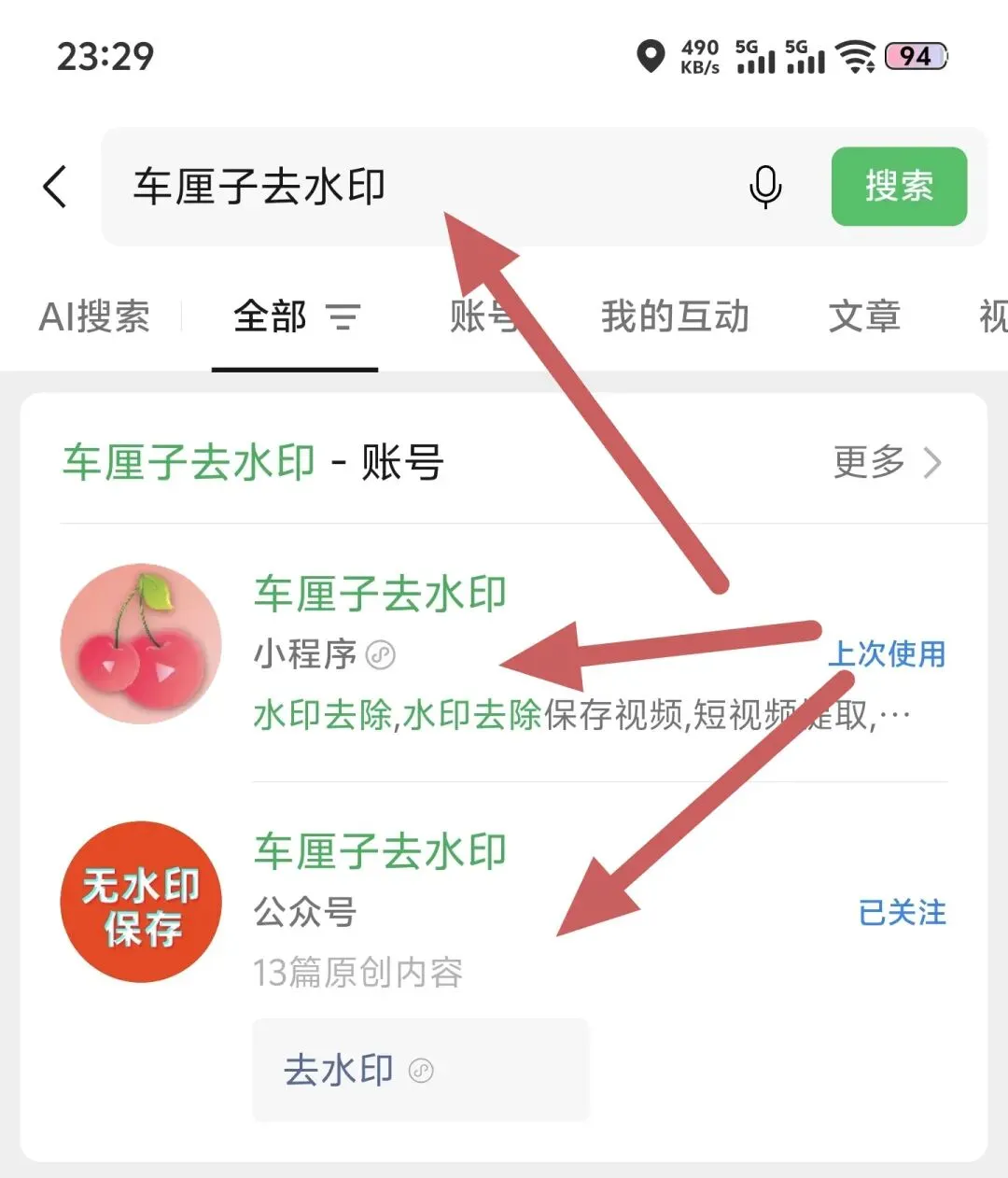 然后,我们会在搜索结果里看到一款樱桃头像的小程序和一个公众号,可以关注一下这个公众号,方便以后获取最新版的小工具。
