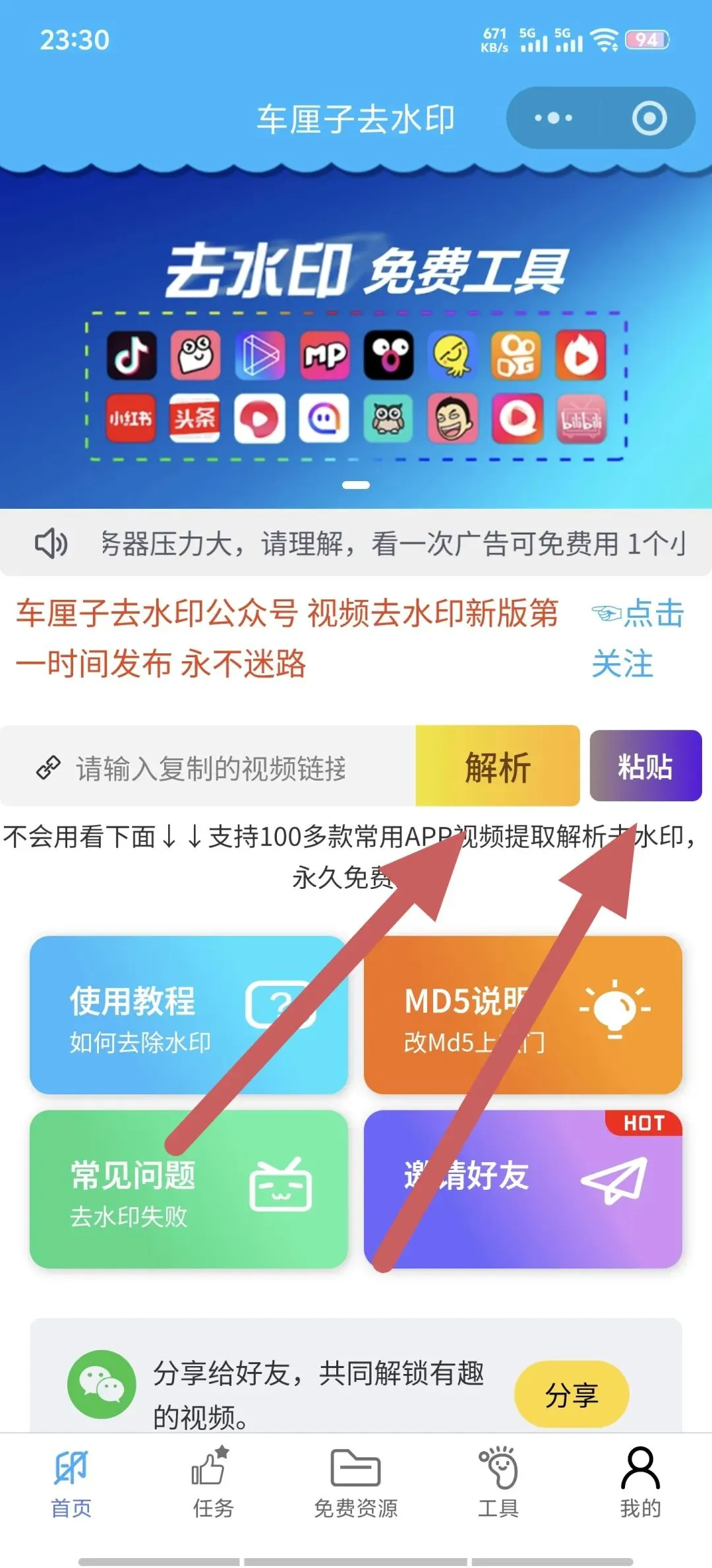刚才我们已经在某音等平台获取到了视频的链接,那么在小程序里直接粘贴就可以了。