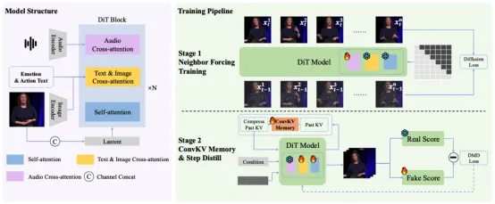 整体上,SoulX-LiveAct 的训练流程分为两个阶段。第一阶段采用 Neighbor Forcing 完成音频、文本条件与视频生成之间的稳定对齐。第二阶段将 ConvKV Memory 引入到 DMD 风格的蒸馏训练中,使模型在推理时可以保持固定长度的 KV cache,从而支持稳定的长时实时生成。