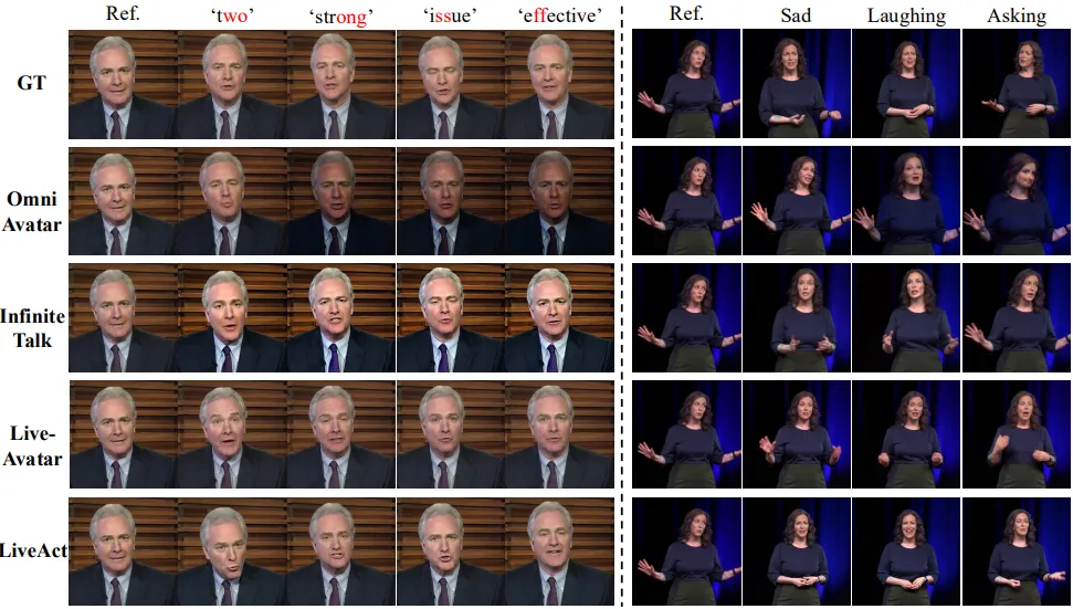 在此基础上,论文进一步提出 ConvKV Memory。它将历史 KV 分成两部分处理:近期上下文保留为未压缩的短期记忆,以保证精度;更早的历史则通过轻量级 1D convolution 持续压缩成长期记忆,并结合 RoPE reset 保持位置对齐。这样,模型既能利用远距离历史信息,又不会让 KV cache 无限增长,从而实现固定内存、稳定时延的长时生成。 此外,LiveAct还加入了 Emotion and Action Editing Module,用于实现表情和动作的可控编辑,让数字人不仅“说得准”,还能够“演得自然”。