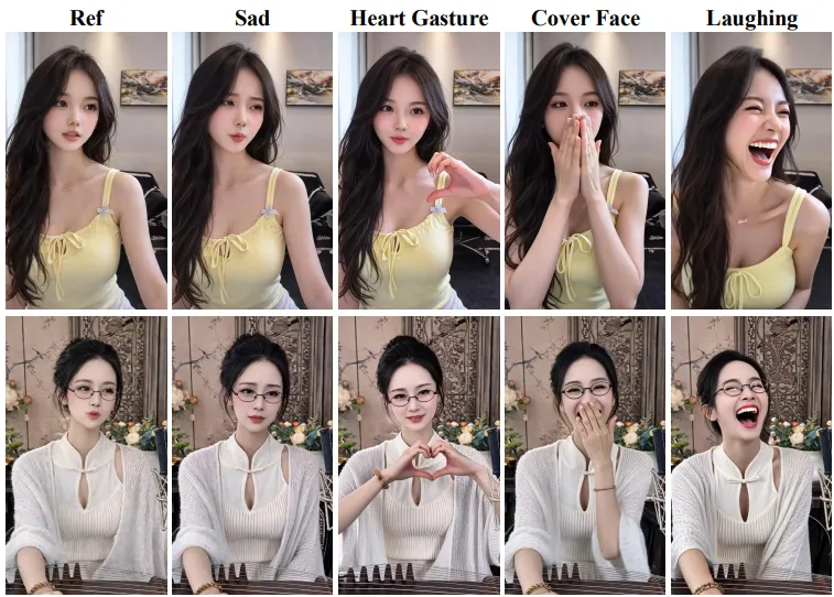 Emotion and Action Editing Module 用于增强数字人的可控性和表现力。它支持对表情和动作进行显式编辑,例如 sad、heart gesture、cover face 和 laughing 等。实验结果表明,该模块可以在保持身份和 lip sync 的同时,实现更平滑的动作过渡,并减少不自然的变形和运动伪影。
