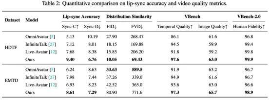 SoulX-LiveAct 在质量、稳定性和效率上都取得了很强的综合表现。 在 HDTF 数据集上,SoulX-LiveAct 的 Sync C 达到 9.40,Sync D 降到 6.76,FID 为 10.05,FVD 为 69.43,同时在 VBench 和 VBench 2.0 指标上也表现领先,说明模型在口型同步、视觉质量和身份保持方面都取得了明显提升。 在 EMTD 数据集上,SoulX-LiveAct 同样取得了很强结果。模型达到 8.61 的 Sync C、7.29 的 Sync D、32.90 的 FID 和 313.6 的 FVD,同时在 Temporal Quality、Image Quality 和 Human Fidelity 等指标上表现突出,进一步说明其在更复杂的全身动作场景下仍具备较强鲁棒性。