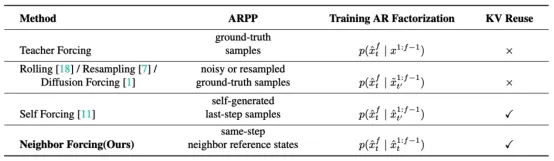 这样的好处在于,目标帧与参考帧始终处在同一个 noise space 中,时间依赖建模发生在一致的扩散状态里,因此训练更稳定,收敛更快,而且天然支持 KV reuse。论文还指出,相比 Self Forcing,Neighbor Forcing 不需要额外的 ODE initialization 训练,蒸馏步数也从 1000 steps 降到了 500 steps。